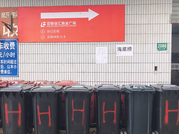 随后记者来到百联商业广场所在的大楼后方,发现了海底捞经理所述的垃圾定点投放场所。“海底捞”、“麦当劳”等店名被贴在墙上以示片区的划分,片区内的垃圾桶也写有商户名称缩写。据该商场物业管理部门介绍,商户的垃圾分类投放后直接由环保部门进行垃圾清运,商场物业并不介入垃圾处理过程。