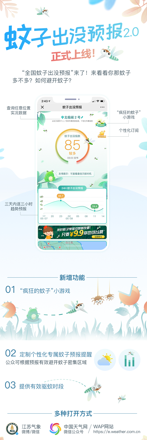 今年,蚊子出没预报2.0版本正式上线,在去年的基础上进行优化。用户除了可以查询所在地的蚊子出没实况数据,以及三天内逐三小时气象条件对蚊子出没影响的趋势预报,还可以定制个性化蚊子预报提醒,有效避开蚊子密集区域,并提供有效驱蚊时段。同时,新增”疯狂的蚊子”小游戏,增加产品的趣味性。