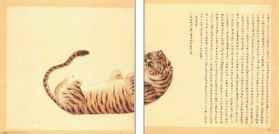 黄抡说,他的先人在明嘉靖年间,一日经过嘉兴某处海涂,“忽见有一大鱼跃上崖,野人欲捕之,以其大,难以徒手得,方欲走农舍取锄棍等物,而此鱼在岸上跌跃无休。逾时,诸人执器械往观之,则变成一虎状,毛足不全,滚于地不能行,莫不惊异。”有老人曰:我听说虎鲨能变虎,今天这只虎正是鲨所变的啊!大家怕它的脚长全了就会跑走伤人,赶快“以锄棍木石击杀之”。聂璜画了一只仰面朝天的老虎,四足为鳍状,正合此事描述。