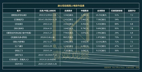 由此可以看出,截至目前,迪士尼动画真人电影经过10年发展后,在中国市场的发展仍然停滞未前。