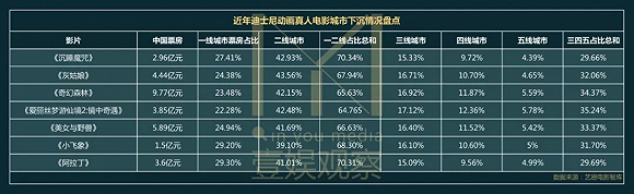迪士尼“通病”本土化营销的缺失,票房下沉乏力“基本上,迪士尼电影在中国本土化的宣传营销还是比较薄弱的,这也直接影响了迪士尼动画真人电影在中国市场的城市下沉。进而导致票房一直不是太理想。”艺恩数据相关负责人告诉壹娱观察(ID:yiyuguancha)。