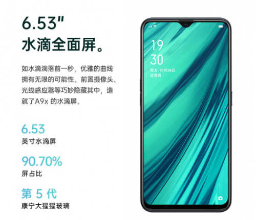 外观方面,OPPO A9x正面采用6.53英寸水滴全面屏,屏占比高达90.70%,表面还覆盖了第五代康宁大猩猩玻璃提升耐摔性。3D凝光渐变机身延续了OPPO手机一贯的高颜值,冰玉白、曜石黑、星光蓝三种配色使OPPO A9x更具质感与活力,尤其是清爽的星光蓝配色更具备夏日气息,同时符合人体工学的微弧曲线设计使机身更加贴合手掌,握持更舒适。