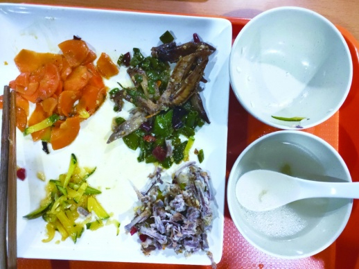 今天午餐很丰盛,估计食堂阿姨今天心情很好,给的菜太多,吃不完。鸡翅膀太辣了,广东人的我快被辣哭了。鸡骨头和熬汤的大骨棒是湿垃圾吗?