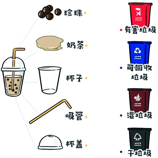 答案:relax,relax,喝不完的奶茶倒水池,珍珠是湿垃圾,冲洗干净的吸管、奶茶塑料盖、杯子——可回收物(若未清洗可直接扔进干垃圾桶)so,最省事的办法就是,要么不喝,要么喝完!
