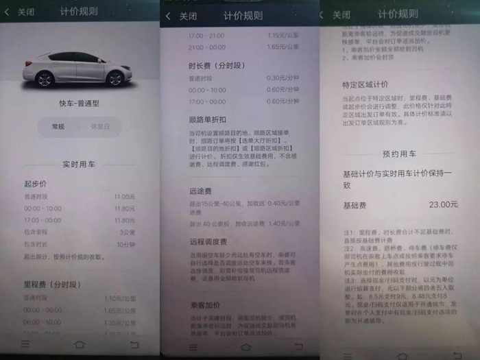 以快车为例:早高峰时段(6点-10点)起步价上涨1元、里程费每公里上涨0.2元,时长费不变;普通时段(10点-17点)起步价不变(13元),里程费每公里下调0.15元,时长费每公里下调0.1元;晚高峰时段(17点-21点)起步价上涨1元、里程费每公里下调0.1元,时长费不变;夜间到凌晨(21点-6点)起步价上涨1元,里程费每公里上涨0.55元,时长费每公里下调0.2元。此外,工作日和休息日之间的价格也有差别。