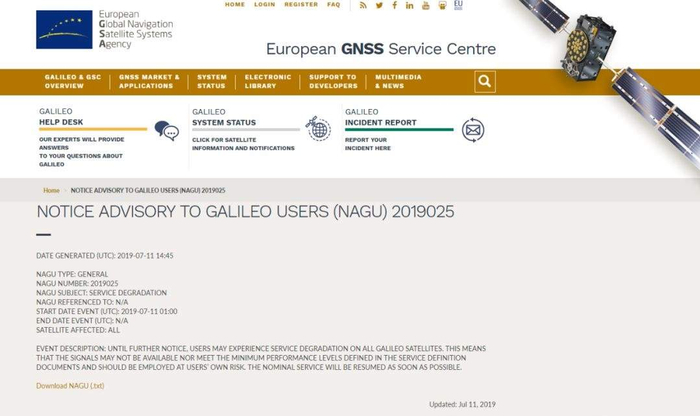 官方11日发布的服务降级公告 图自欧洲全球导航卫星系统局