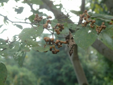 拐枣树的花期并不长,花期后,拐枣树很快结出了一树的扭曲的果实。相比起极为平淡的花朵,拐枣树的果实却很奇特。约摸在中秋前后,人们不难在这条小街上捡到一串串树枝状的成熟的果序枝,它们歪歪扭扭,顶端挂着一颗颗褐色的小球,整体上既没有规整的性状,又没有美丽的光泽,看起来甚至有些丑陋。