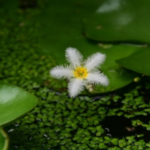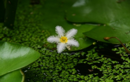 金银莲花,不开花的时候,有着如睡莲一般的心形叶片,而它的名字中又带着莲花,于是让许多人总觉得它也是一种睡莲。只是当它开花时,才发现它们的花朵和睡莲完全不同,这种可爱的水生植物会开出白色的小花,边缘和花冠的腹面生长着流苏状的绒毛,花心喉部明黄色。花瓣洁白,喉部金黄,金银搭配,相得宜彰,难怪它有着金银莲花的名字。