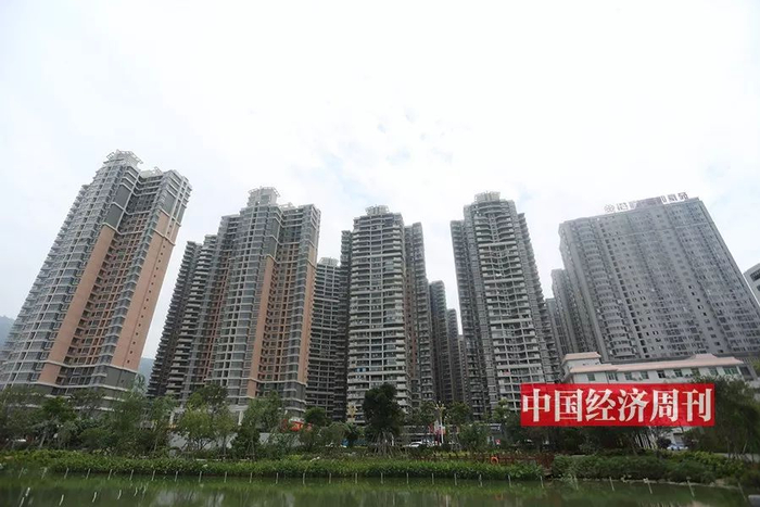 “名邦豪苑”西南角(图左)有 2 栋早已完工的 33 层建筑,楼内空无一人。《中国经济周刊》记者 胡巍 | 摄