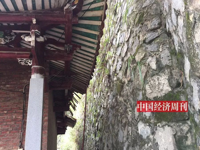 上图 :围墙之下,月峰寺的房舍空间逼仄。下图 :黄志贤所建的左侧围墙,导致通向寺院的道路最窄处只有一米多宽。《中国经济周刊》记者 胡巍 | 摄
