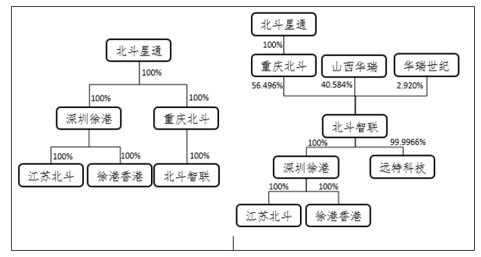 上述增资完成后,北斗智联将以现金3.37亿元收购深圳徐港100%股权,以现金2.98亿元收购山西华瑞及华瑞世纪持有的远特科技99.9966%股份。交易完成后,公司通过重庆北斗间接持有北斗智联56.496%股权,山西华瑞持有北斗智联40.584%股份,华瑞世纪持有北斗智联2.920%股份;北斗智联持有深圳徐港100%股权及远特科技99.9966%股份。