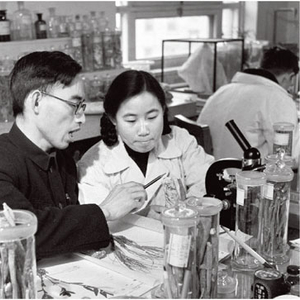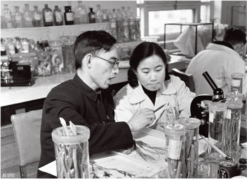 20 世纪50 年代,屠呦呦(前右)与老师楼之岑一起研究中药。