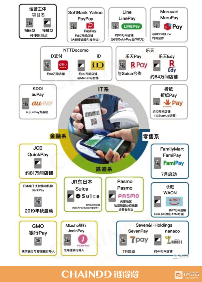 与中国支付宝一家独大态势不同,日本众多的在线支付和移动支付各成体系。目前日本4大行业均通过不同方式切入移动支付,占比最大的是IT行业,其次是实力最强的金融系,落地应用最广泛的铁道系统和零售系统各不相同。