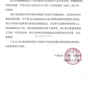 澎湃新闻注意到,前述网传这份由千麦实业(上海)有限公司下发,名为“关于暂停销售LA TOURANGELLE 产品的紧急通知”的文件指出,因 LA TOURANGELLE产品在抽查中发现部分产品含有“邻苯二甲酸酯类物质”成分残留,不符合原卫生部办公厅文件《卫办监督函(2011)551号》的要求。千麦实业(上海)有限公司近期对其所有批次核桃油产品进行全面检测后,发现均存在该物质残留问题,生产商 LA TOURANGELLE SAS强调该程度的残留是无害的,本着对消费者负责的态度谨慎起见,公司决定即日起暂停销售所有LA TOURANGELLE产品。文件要求各渠道代理商请紧急安排下架事宜,统计批次数量等候进一步召回安排。