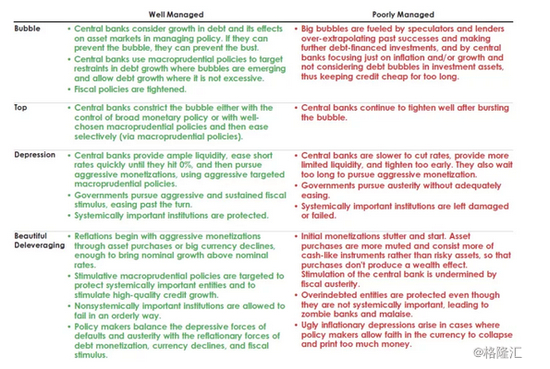 我们认为在债务泡沫,资产价格顶部,去杠杆和经济衰退中,管理层都有不可推卸的责任。好的管理和差的管理差别很大。在泡沫阶段,好的管理会将债务增长作为目标,财政政策开始收紧,来管理债务的泡沫。坏的管理会被市场投资者驱动,管理层仅仅看到通胀和经济增长,导致流动性长期以很便宜的价格出现。在债务周期顶部的时候,好的管理通过货币政策,微观流动性操作来缓和泡沫的顶部。而糟糕的管理就是不断收紧收紧再收紧,刺破泡沫。在经济萧条中,好的管理是杨浩提供足够多的流动性,推动充裕的流动性,将短期利率迅速降低到0%。而糟糕的管理是缓慢降低,提供有限的流动性,过早的收紧。在去杠杆阶段,好的管理会快速的货币化,资产的收购以及货币的贬值,将名义增速带动利率水平之上。而糟糕的管理则是几乎没有资产的收购,并没有基于财富效应做任何的动作。