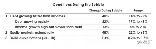 下面这张图是泡沫发生的一些条件。我们看到债务增长超过了收入增速,股票市场出现上涨,国债收益率下降。