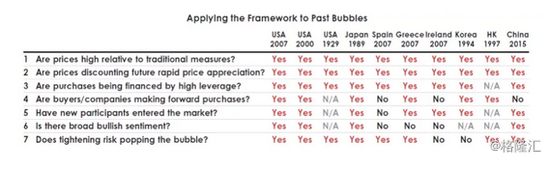 那么判断一个泡沫有什么标准码?下面是我们对于过去几次泡沫研究后,列出的统一标准。这里面有7个标准:价格相对历史平均是不是过高,价格是不是包含了未来快速升值,购买是不是通过高杠杆完成的,购买者是不是在未来防止未来价格继续上涨做一些套期保值,是不是有新的参与者进入市场,是不是有全面牛市的情绪,收紧是不是会刺破泡沫。