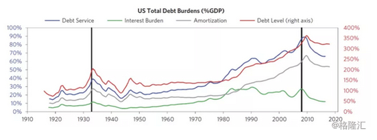 下面这张图是美国1910年以来的债务和债务上限。你会发现利息支付很平稳,而债务不断向上。所以债务成本的上升幅度没有债务上升的幅度那么大。这是因为美联储不断降低利率水平,维持债务融资的持续扩张,直到有一天他们什么都不能做了(利率降低到0)。当这一天来临时,去杠杆就开始了。