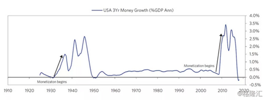如何管理经济萧条?前面我们提过,管理层有四个选择:紧缩,债务重组,债务货币化或者印钞,财富再分配。每一个选择对于经济的影响都不同,关键是如何把这些选择做好。很多时候,管理层会做出错误的选择。在一开始政府是不愿意出手的,这将导致经济萧条更加严重。2008年美国金融危机,政府出手很快,导致经济萧条时间很短。但是1930年美国大萧条和80年代日本失落的十年,政府出手很慢,导致了很长时间的萧条。从具体案例的角度看,我们看到下图美国政府在1930年大萧条印钞程度和2008年印钞程度。明显2008年以更快的速度向市场注入流动性,吸取了1930年的教训。