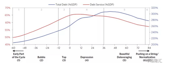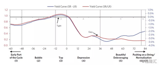 下面这张图展示了一个长期债务周期的七个部分。我们接下来会一个个和大家分析。