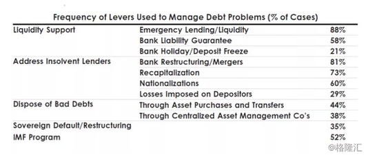 关于债务重组,我们也会看到有几种做法。一种是提供流动性,包括银行流动性,紧急借贷。一种是解决放款人的债务问题,包括债务的重组,重新资产化,债务国有化。一种是如何剥离掉债务,包括成立资产管理公司来吸收这些债务(中国在90年代曾经成立四大资产管理公司来吸收银行的坏账)。最后一种是主权违约和重组。下面这张图我们看到在48个案例中,这些做法和工具的使用比例。最常用的还是流动性管理工具,提供紧急贷款和流动性。债务重组合并,债务的国有化也是被经常用到的。我们在2008年金融危机看到美国银行的国有化,其实也是一种常见的做法。