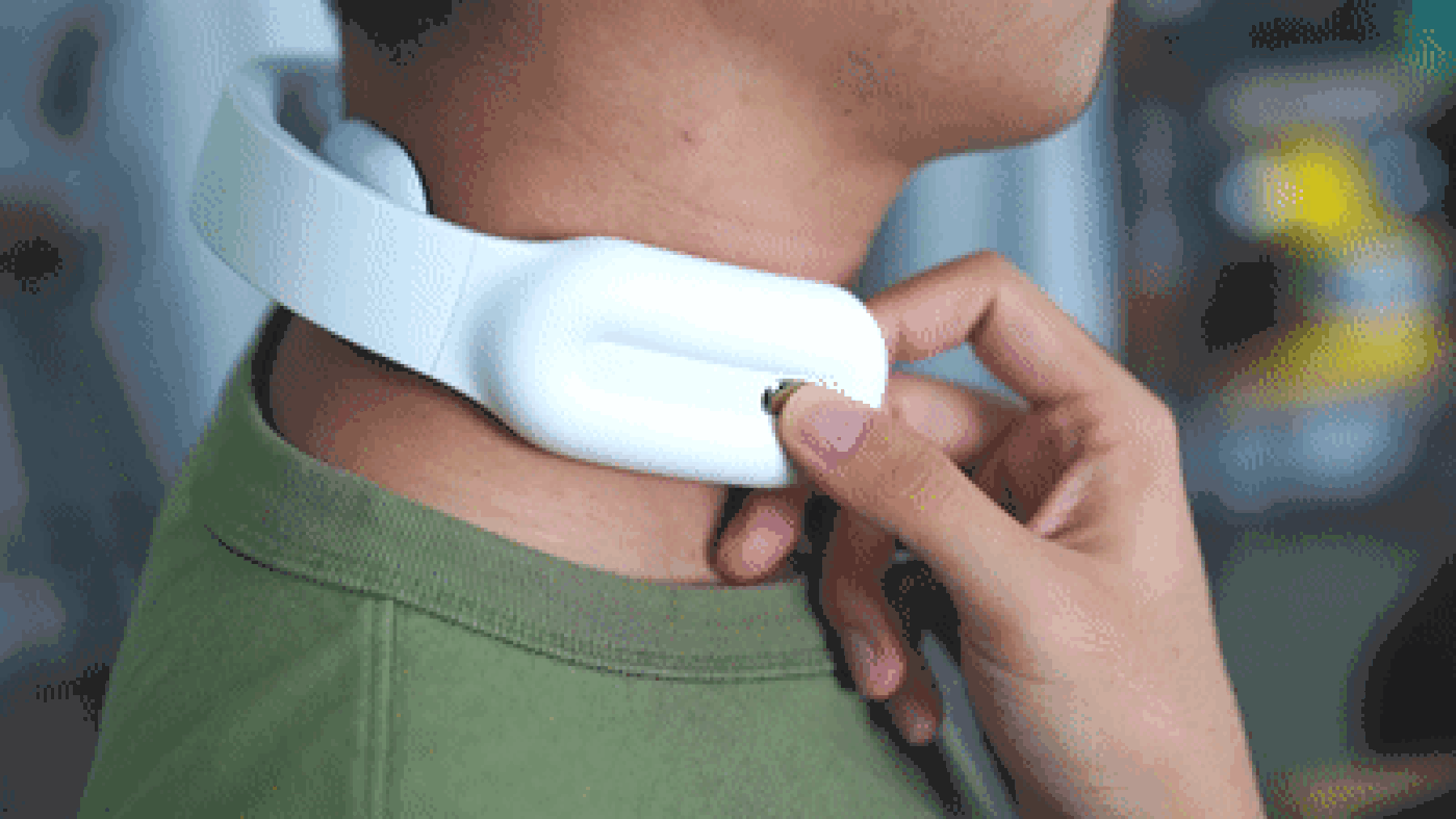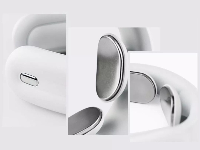 个性化的细节设计,颈椎按摩处是奥氏体304不锈钢电极片,前端是两个透气亲肤的硅胶气囊护颈,让佩戴更舒适。