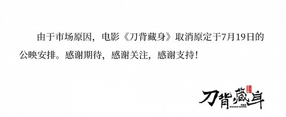 7月15日,由徐浩峰执导,许晴、张傲月、春夏、黄觉等主演的电影《刀背藏身》也官宣撤档,这已经是2019年暑期档第四部宣布撤档的影片。片方给出的理由是出自于“市场原因”考量,市场已经如此空旷,不知道原因又出在哪里。