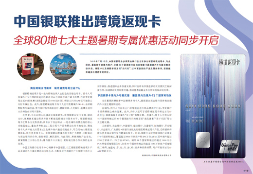 2019年7月15日,中国银联联合多家商业银行在北京推出银联跨境返现卡,与此同时,覆盖数千家境内商户、全球80个暑期旅行目的地银联卡暑期境内外专属优惠活动开启。银联卡以及银联移动支付“云闪付”,以丰富创新的产品及服务体系,受到越来越多出境游客的欢迎。