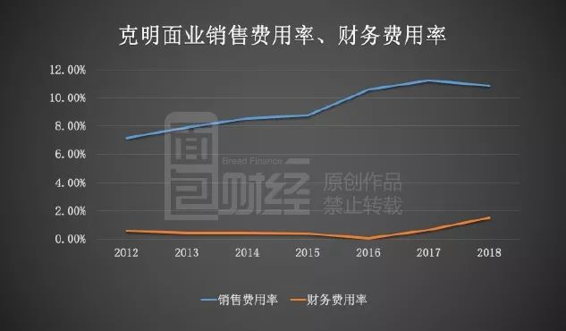 以2018年为例,克明面业的销售费用率为10.86%,相比2012年的7.17%上升明显。从绝对额来看,销售费用从2012年0.72亿上升至2018年3.10亿,复合增速为27.55%,高于期间营收复合增速的19.07%。