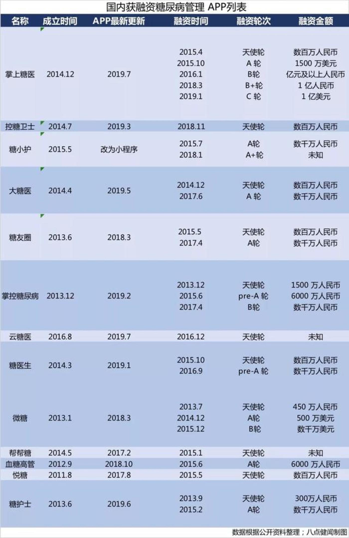 八点健闻根据公开信息统计,现在还在持续运营的糖尿病APP有7家,其中就包括已经建立起融资壁垒的掌上糖医。
