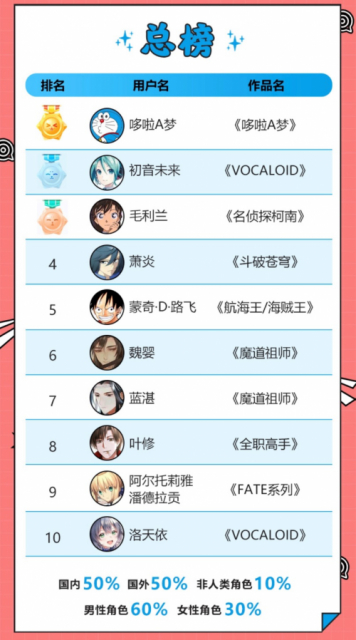 在国内角色榜中,萧炎、魏婴、蓝湛、《全职高手》的叶修、《VOCALOID》的洛天依排名前五,其中男性角色占50%,女性角色占30%,非人类角色占20%。在海外角色榜单中,哆啦A梦、初音未来及毛利兰位居海外角色榜前三,其中男性角色占50%,女性角色占30%,非人类角色占20%。