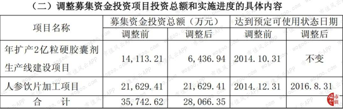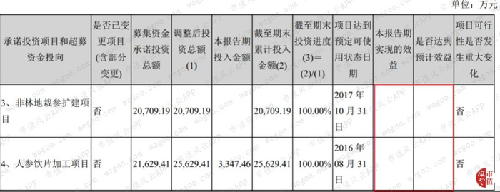 2011年IPO时超募了9.62亿,主要投向了非林地栽参扩建项目和人参饮片加工项目,在这两个项目的可行性报告中,都披露了预期的收入和净利润。