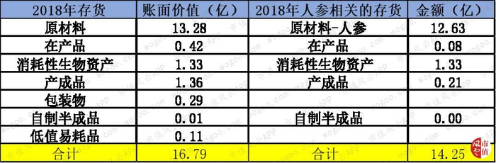 2018年的资产中,2/3是存货,其中人参相关的存货占比高达84.85%,16.79亿存货中就有14.25亿是人参相关的。