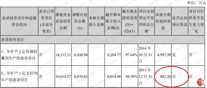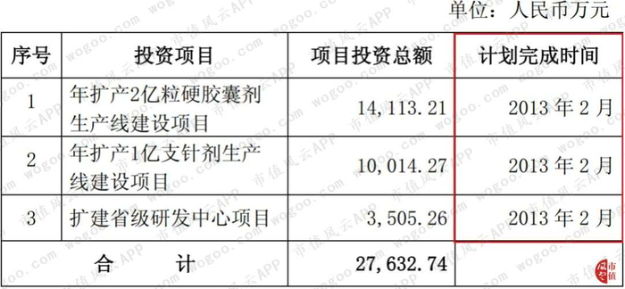 2011年IPO时募投项目主要有两个:年扩产2亿粒硬胶囊剂生产线建设项目和年扩产1亿支针剂生产线建设项目,本来计划完成时间是2013年2月。