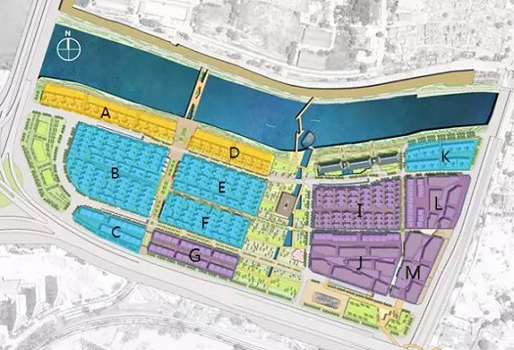 D区域为沿河商墅,C、G区域为商办用地,B、E、F、I四部分为住宅别墅区。