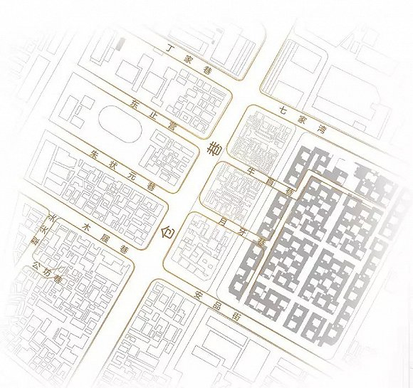 安品园舍采用了“街巷院井”的传统空间组合方式,恢复历史上月牙巷、牛首巷,尊重了地段内原有的街道布局,整个片区以仓巷为南北主要街巷,并向两侧延伸形成东止马营、牛首巷、丁家巷、七家湾、朱状元巷、月牙巷、木屐巷、安品巷八条小巷,形成“街-巷-院-井”的独特风格,从高空俯瞰形似一条“八爪金龙”。