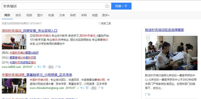 记者在某搜索引擎输入“针灸培训”的字眼,搜索出了近八百万个结果。其中不少培训机构号称开设了针灸速成班,不乏一些3到4天包会之类的宣传口号。