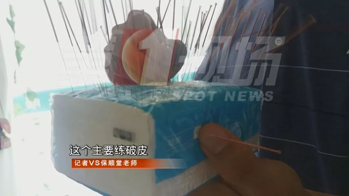 说是要记700多个穴位,可是李老师教了不到两天的课程,就开始要求进入实操阶段。记者跟很多学员一样,还没记住多少穴位,就已经被赶鸭子上架。有的学员拿纸巾练手,一包纸巾很快被扎成了马蜂窝。