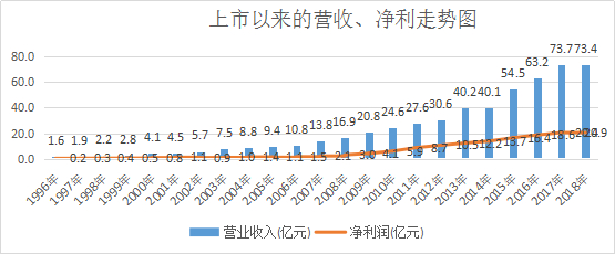 1993年由国有企业改组为股份制企业。1996年成为上市公司,同年7月29日“东阿阿胶”A股股票在深交所挂牌上市。当年,营业收入1.6亿元,净利0.2亿元。
