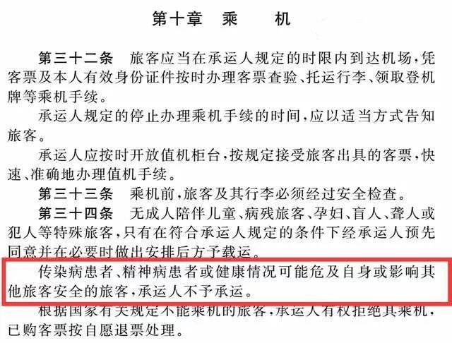 《中国民用航空旅客、行李国内运输规则》第34条规定,传染病患者、精神病患者或健康情况可能危及自身或影响其他旅客安全的旅客,承运人不予承运。