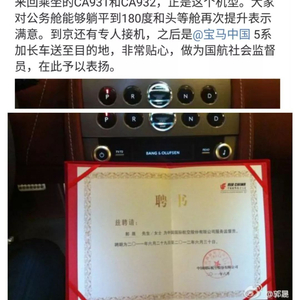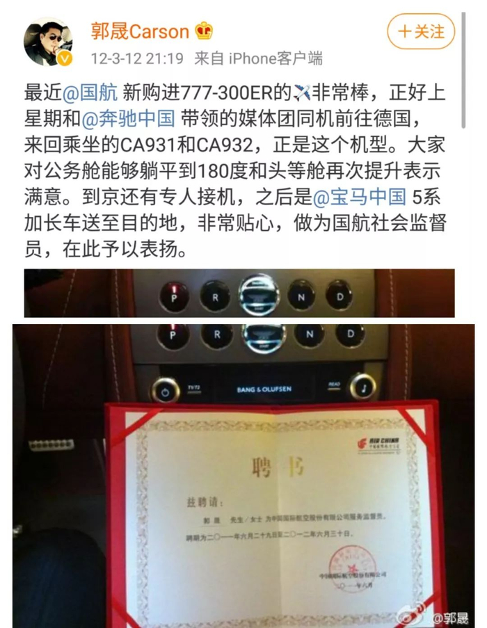 随后有网友翻出了2011年6月国航颁发给名为“郭晟Carson”网友的社会监督员证书,在它这个微博上,还非常开心自己成为了国航服务监督员。