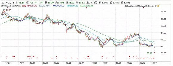 自2017年年中以来,东阿阿胶股价持续下挫,从2017年最高点71.35元下降到35.42元,降幅超过50%,公司的动态市盈率估值也从2017年的最高点93.82一路下降到目前的12.4。而如今,业绩又出现了大幅的下滑,这就很可能导致公司估值进一步下挫,导致戴维斯双杀。
