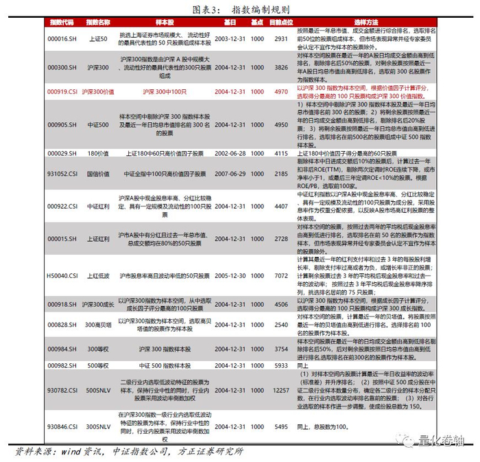 本节我们摘取了市场主流的几只宽基指数和Smart Beta指数,对指数的要素和编制方法做一个对比。