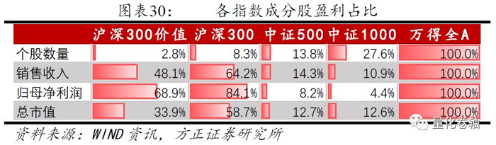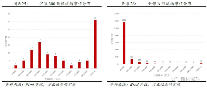 沪深300价值的100支成分股占到了A股总市值的34.22%,流通市值的25.65%,可见持仓风格偏向大票。流通市值大于1000亿的公司就有31家,仅2家公司的流通市值小于100亿元。