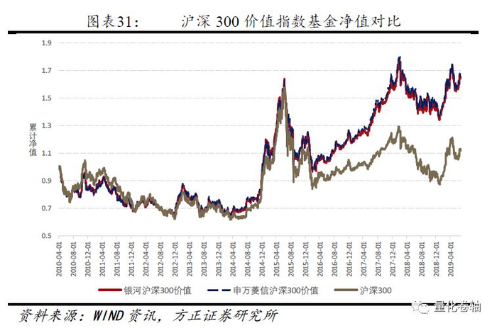 目前有两款基金产品跟踪沪深300价值指数,分别是银河沪深300价值(519671.OF)和申万菱信沪深300价值(310398.OF),两者走势基本一致。从图表31可以看到,两者相对沪深300指数产生了明显的超额收益,尤其是最近5年分化明显。