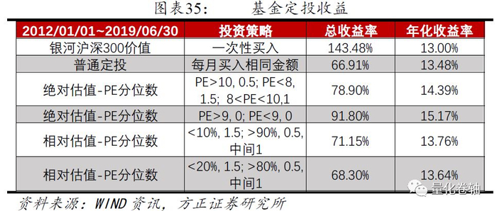在简单的“定时定额”投资基础上,我们可以结合指数估值的方式,指数估值高时少投,估值低时多投。例如PE>10,买入0.5份;PE<8时,买入1.5份;8<PE<10时,买入1份,年化收益率提升至15.17%,总收益率提升到98.8%。也可以采取结合指数历史PE分位数的方法进行投资,收益见图表35。