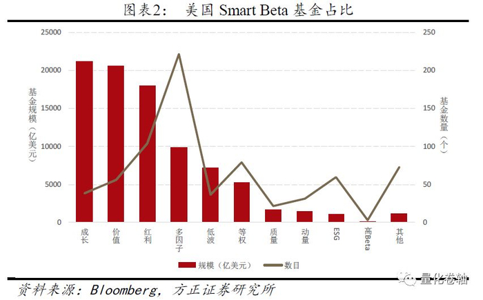 截止2019年6月,我们根据Bloomberg口径统计了美国Smart Beta基金的现状,总规模达到8.7万亿。价值、成长、红利这三款产品规模最大,三者合计占到了68%的市场份额,其中成长和价值Smart Beta产品各自都超过了2万亿美元。