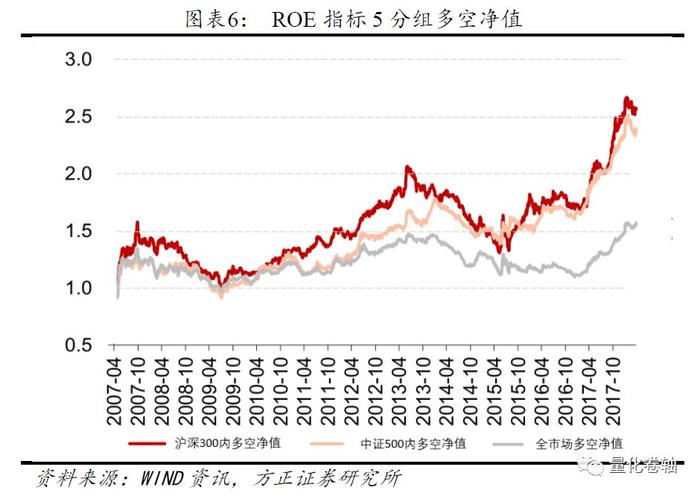 其次,回测结果表明,滚动持有低PB的股票往往是能带来超额收益的(详见图表12和13),而高ROE的股票的收益是不太确定的。图表6我们对ROE单指标选股能力做了回溯测试,在沪深300、中证500、和全市场上构建五分组下的多空组合,理想的Alpha因子应该呈现稳定上升的曲线,实际ROE多空净值波动较大。测试结果表明A股上静态ROE的选股效果欠佳,高ROE的股票没有稳定的超额收益,沪深300内ROE选股效果>中证500>全市场。