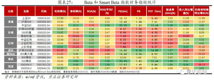 从基本面指标看,宽基指数和各个Smart Beta指数的风格暴露也有所不同,价值指数和红利指数的风格暴露有些类似,PE、PB、PCF低、股息率高;另一个风格组合是成长和高贝塔,估值高但增速快,这个风格在最近5年表现一般。