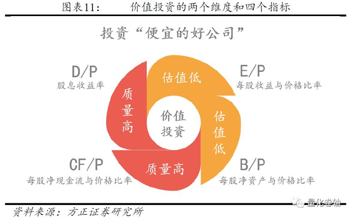 最后,如果不通过ROE,那么沪深300价值指数和180价值等价值指数是如何筛选好公司的呢?详细解读指数的四个筛选指标,我们可以发现除了E/P和B/P被用来衡量估值维度外,CF/P和D/P可以认为是用来衡量公司质地的,好的公司往往具有稳定的净现金流和股票分红,这些指标就将康美药业新等近期暴雷的股票排除在外,在2.4节我们对四个指标再做详细的测试。